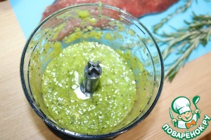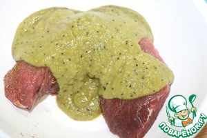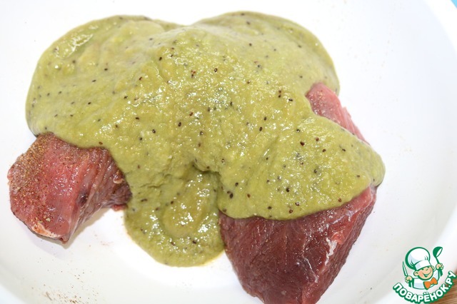 Мясо посыпать со всех сторон солью и немного специями. И хорошо намазать нашим маринадом.