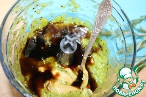 В эту кашицу добавить соевый соус, масло и горчицу. Хорошо перемешать.