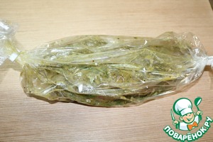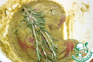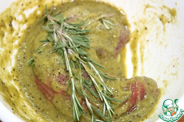 Сверху мяса кладём веточку розмарина. Он придаст особый аромат нашему мясу. В таком виде оставляем мариноваться минимум на 3 часа.