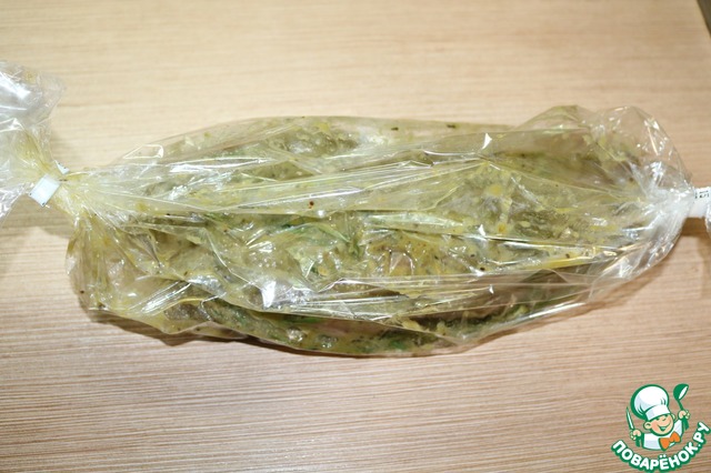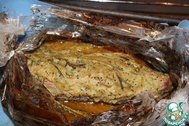 Далее наше мясо помещаем в рукав для запекания вместе с маринадом. И отправляем в духовку разогретую до 200 градусов на 1 час.