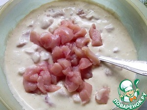 Добавляем молоко, комнатной температуры, можно чуть больше или меньше. Тесто должно получиться на очень жидким, но и не густым, по консистенции как домашняя сметана. Перемешиваем не оставляя комков. Туда же добавляем нарезанную куриную грудку.
