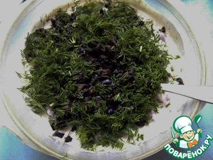 Добавляем мелко нарезанные маслины и укроп. Перемешиваем. Можно добавить еще специй и соли, если Вам кажется что мало.
