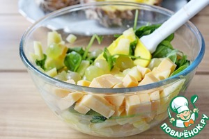В миску выложить кубики ананаса, кубики сыра, белый виноград, шпинат беби (по желанию).