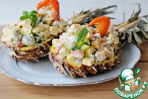 Выложить салат в подготовленные лодочки ананасов, украсить креветкой. Подавать охлажденным!