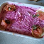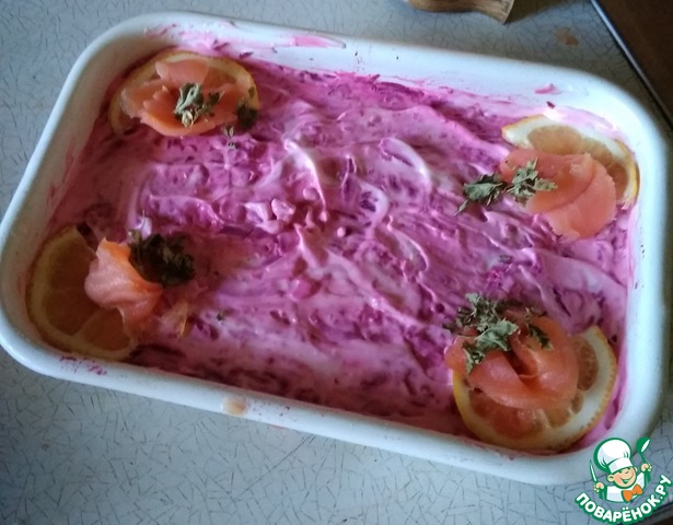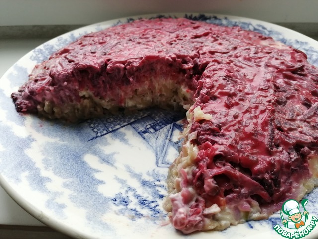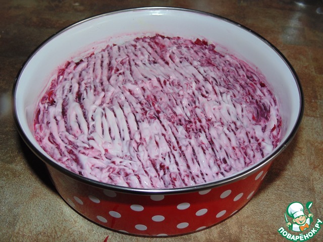 Ну и конечно же свекла! Для лучшей пропитки я между каждым слоем промазывал майонезом! Украшаем наш салатик морковкой и в холодильник настаиваться к праздничному столу!