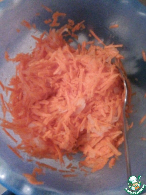 Среднюю морковь и большую луковицу натерла на большой терке.