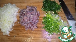 Лук, сельдь некрупно нарезать, зелень измельчить.