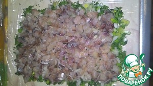 Затем, на сельдь выкладываем "крем". Пытаться намазывать эту смесь нет смысла, так как кусочки сельди будут "прыгать" и расползаться со своего места.