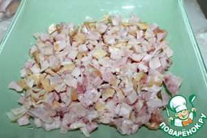 мясо с окорочка нарезать мелким кубиком (можно взять копченую куриную грудку) -