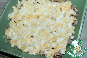 Яйца отварить, нарезать кубиком, посолить и смешать с майонезом в отдельной миске. затем выложить слоем на мясо