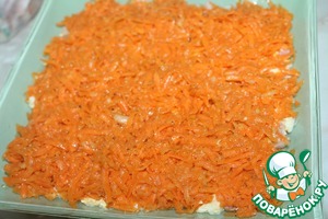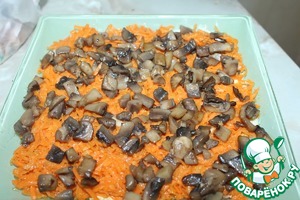 Шампиньоны предварительно промыть, нарезать кубиком и обжарить на сливочном масле (без лука!). когда немного остынут выложить сверху морковки. покрыть грибы майонезом