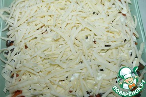 После того, как промазали грибы майонезом, посыпаем обильно, натёртым на крупную тёрку, сыром. снова промазываем майонезом