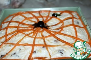 По желанию, можно из морковки выложить паутину, а из маслинки сделать паучка. дать салату немного настояться (накрыв сверху пленкой или крышкой, чтобы не заветрился)
