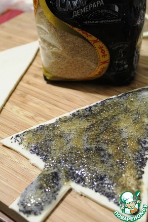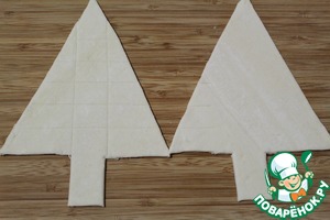 Из слоеного теста вырезать равнобедренные елочки - на 1 готовую елочку две заготовки.