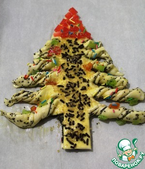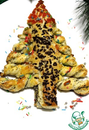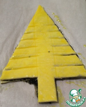 Наложить вторую половину елочки на сторону, смазанную маком. Смазать желтком и разрезать как на фото.