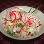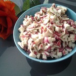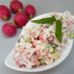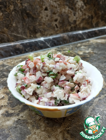 Нарезать редис мелким кубиком. Крабовые палочки нарезать так же мелко или просто ломтиками. Нарезать зелёный лук. Загрузить всё в салатник. Добавить майонез или йогурт.