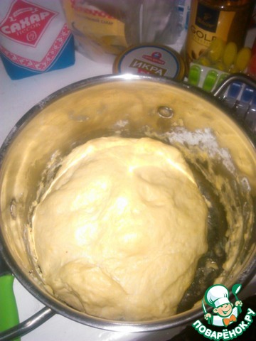 Замесить тесто. В конце замеса добавить растительное масло. Оставить на 30 мин. в теплом месте, обмять и оставить еще на 30 мин.