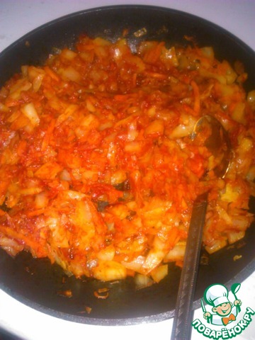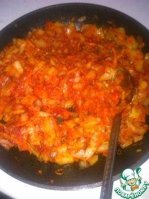 Пока тесто поднимается, подготовить начинку. Потушить капусту с морковью, добавить к ней чайную ложку сахара, можно добавить томатную пасту.