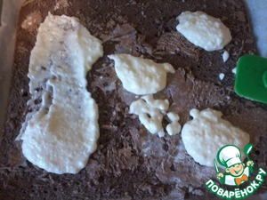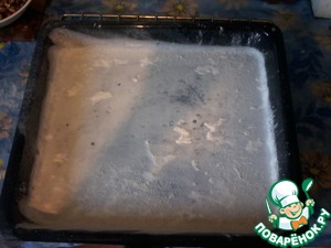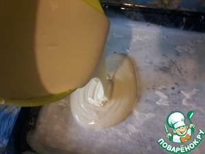 Сразу же выливаем его на противень, равномерно распределяя. Ставим в разогретую духовку (200 градусов) примерно на 25 минут. Духовку во время выпечки не открываем.