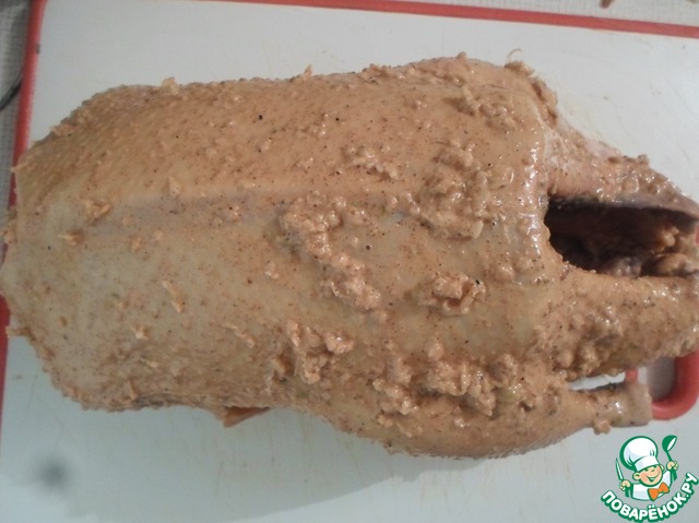 Внутри и снаружи тщательно натираем утку маринадом