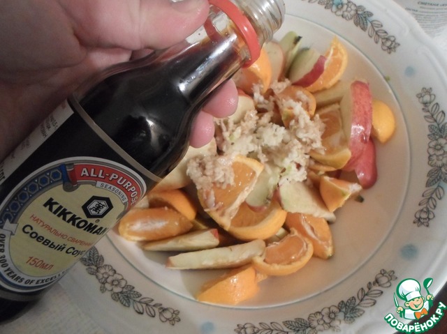 Яблоки и мандарины моем и вместе с кожурой нарезаем дольками. Чеснок пропускаем через чеснокодавку. Можете добавить соевый соус в посуду к фруктам, либо влить соус во внутрь.