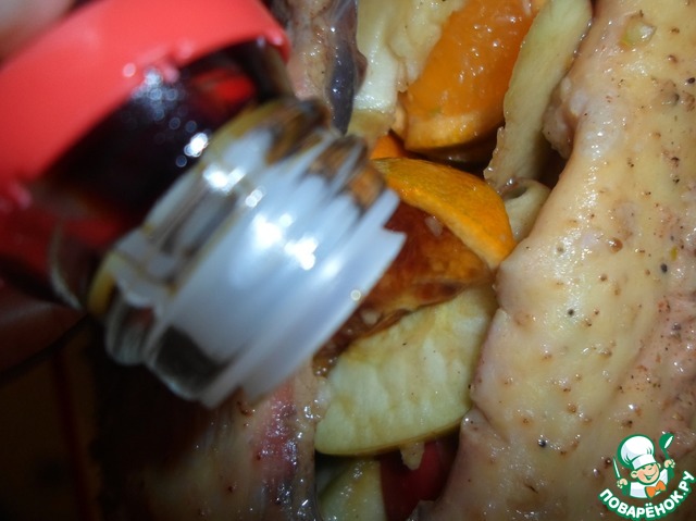 Фаршируем птицу фруктами и вливаем во внутрь соевый соус.