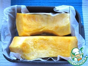 Дольки тыквы выкладываем кожурой вниз в форму для выпечки, застеленную пекарской бумагой.