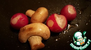 Разогреть в сковороде оливковое масло, выложить целые помидоры и слегка обжарить со всех сторон. Достать помидоры, разрезать на дольки и выложить на салат. В той же сковороде слегка обжарить шампиньоны, порезанные на половинки и редис.
