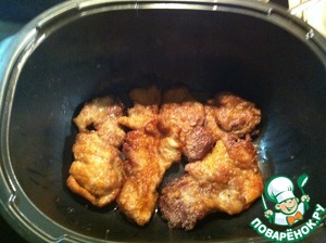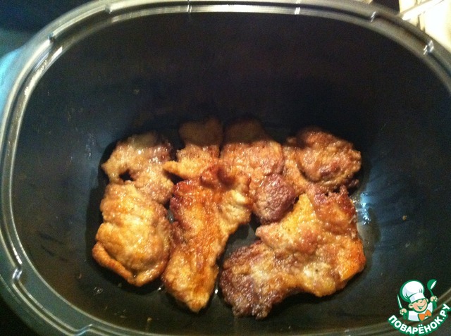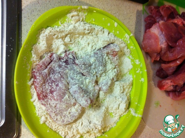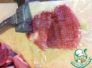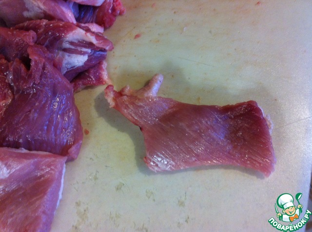Мясо стараемся выбрать не очень жирное, режим на куски размером с ладонь, толщиной в палец. Лишний жирок по желанию можно срезать.