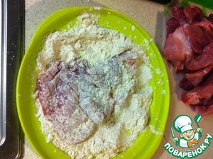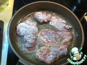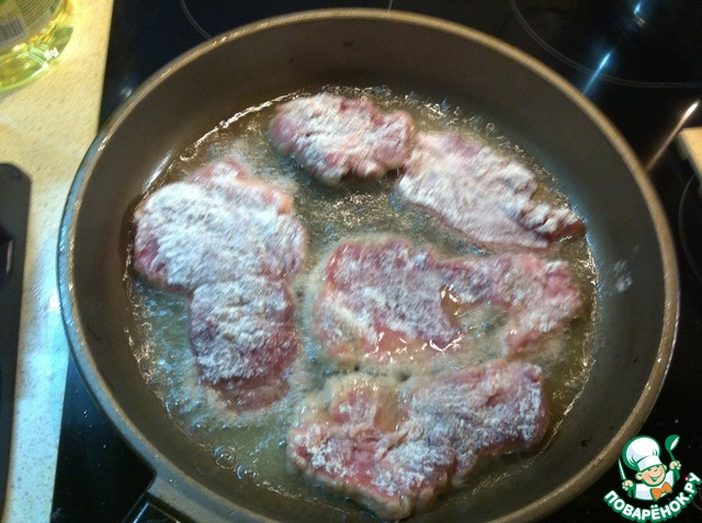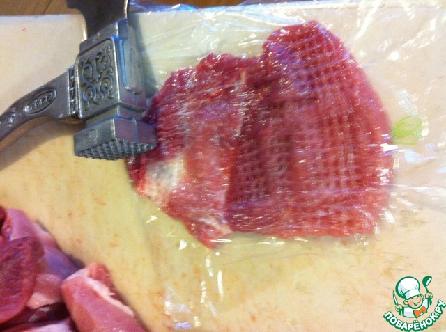 Хорошо отбиваем, солим и перчим. Перед тем как отбивать, можно накрыть кусок мяса пищевой пленкой, тогда мясной сок не будет разбрызгиваться в разные стороны.