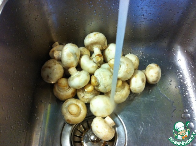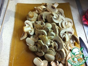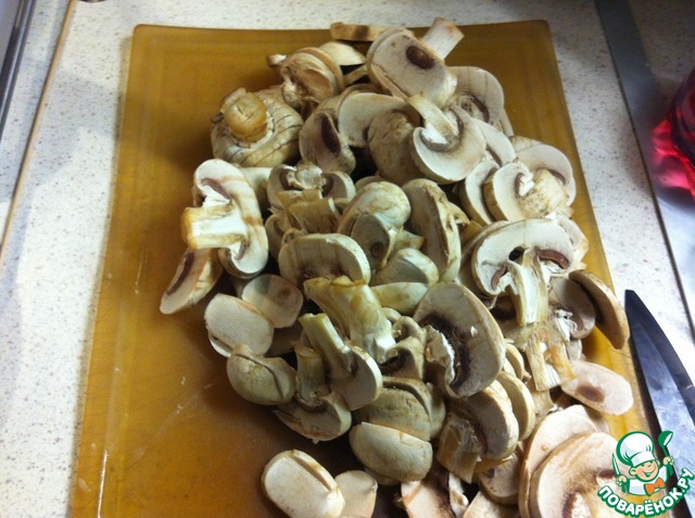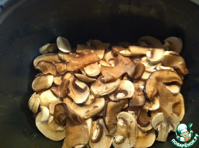 Сверху слой грибов. Если остались кусочки мяса, можно продолжить слои, но главное верхний слой должен быть грибной.
