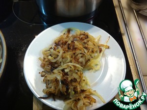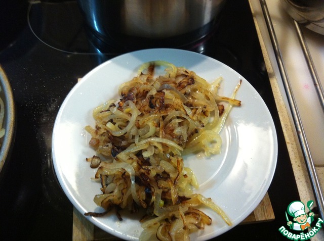 Лук очищаем, режим полукольцами и обжариваем на растительном масле.