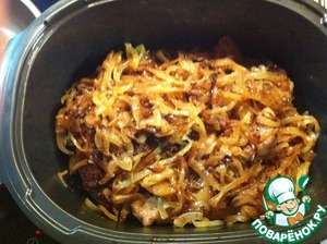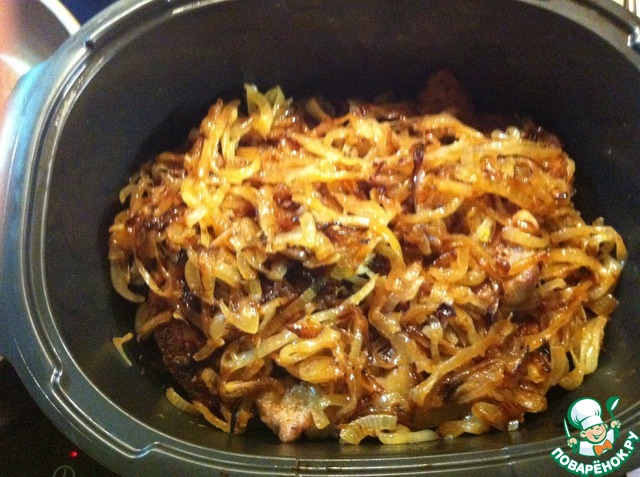 В утятницу или высокую форму для запекания, выкладываем слой обжаренного мяса.