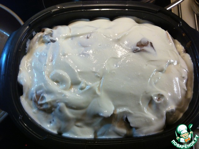 Все заливаем сметаной, разравниваем сметанный слой и ставим в духовку на 1 час при t 180 градусов. Уверена, что готовое блюдо, обязательно вас порадует!!!