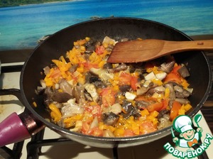 Во время обжарки постоянно помешиваем грибы и овощи.