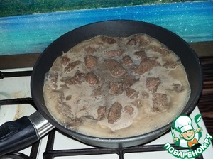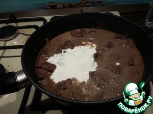 После 40 минут выливаем в мясо молоко и выкладываем сметану, тушим еще 10 минут. -