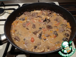 Через 10 минут выкладываем заправку в мясо, солим по вкусу, перемешиваем и как только забулькает выключаем.