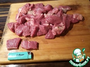 Моем, просушиваем мясо, нарезаем кусочками примерно 3 на 4 см и толщиной примерно 1 см.