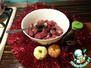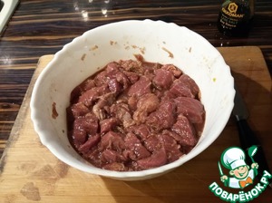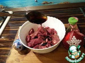 Закладываем мясо в емкость, заливаем соевым и гранатовым соусом и перемешиваем.