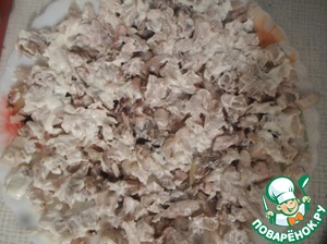 Первым слоем выкладываем курицу, промазываем слой небольшим количеством майонеза.