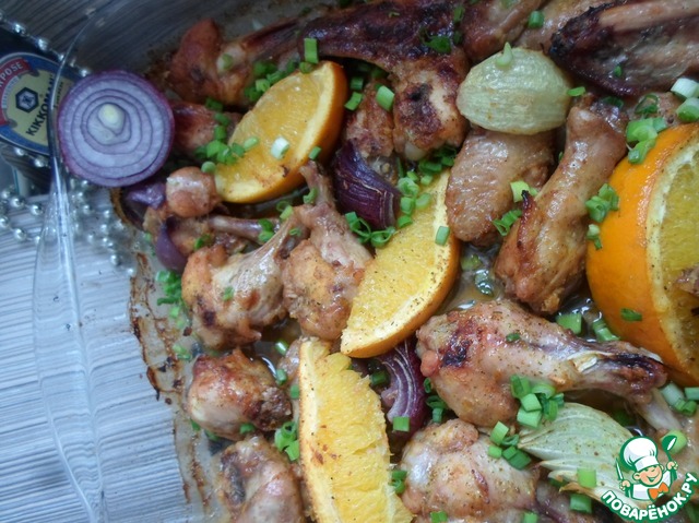 На дно формы выкладываем крылышки, между ними в произвольном порядке выкладываем дольки лука и апельсина. Не много поливаем растительным маслом и посыпаем приправой Хмели-сунели. Запекаем при температуре 200 градусов 40 мин.