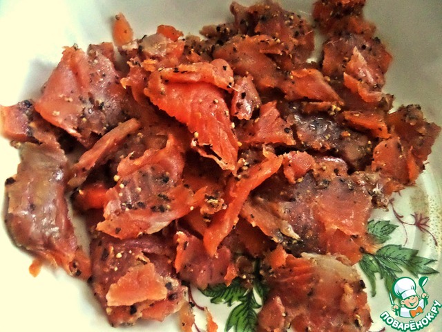 Берём любую рыбку, можно использовать обрезки. Я покажу на примере упаковки слабосолёного лосося. Он ещё в лимонном перце.