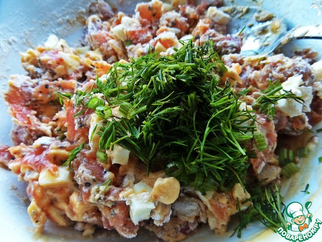 Покрошить к рыбе варёные яйца и одно сырое для связки.