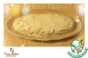 Придать форму, если это необходимо и аккуратно промазать верх и бока салата тоненьким слоем майонеза.