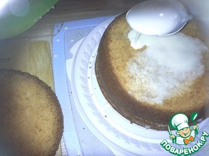 Готовим пропитку. Стакан песка взбить со сметаной до растворения. И пропитываем каждый корж обильно.