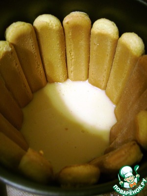 Дно разъемной формы застелить пищевой пленкой, защелкнув ее бортиком. Выставить палочки бисквитного печень савоярди по кругу сахарной стороной наружу.