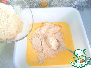 Выливаем нашу смесь в ёмкость для замешивания теста. Высыпаем муку с пряностями и перемешиваем.