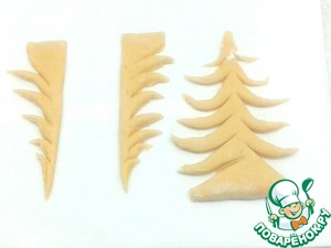 После выпечки, пока изделие горячее, примеряем ёлку к выемкам и выравниваем
