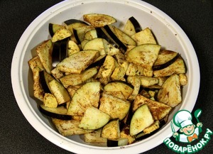 В отдельную посуду кладем баклажан и бананы, добавляем порошок куркумы и чили, соль по вкусу и хорошо перемешиваем.