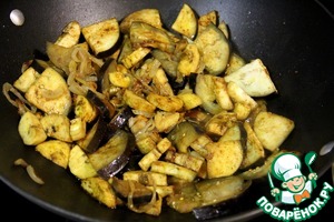 Помещаем лук и бананы с баклажан на разогретую сковороду с растительным маслом и тушим. Можно добавить немного воду, если получается слишком сухие.